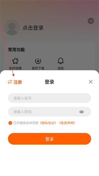 3、在下方弹出的登录方式中,选择并点击左上注册的按钮。