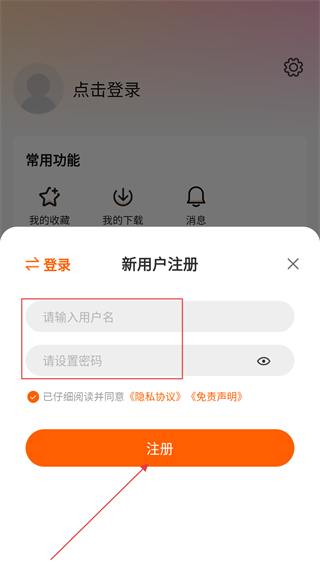 4、在注册的页面内,输入用户名、密码再点击注册即可。