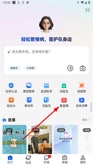 1、在老来健康应用首页,找到并点击看直播功能入口。