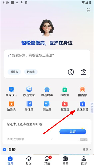 1、打开老来健康app,在首页找到并点击退休测算选项,进入退休测算页面。