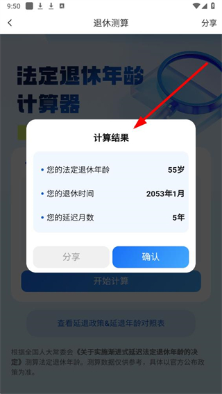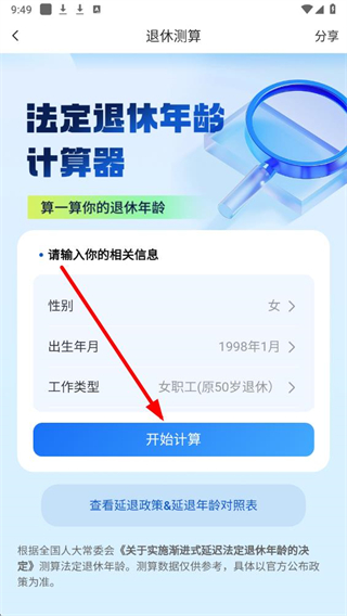3、信息填写完成后,点击开始计算按钮,等待系统生成退休年龄相关结果。