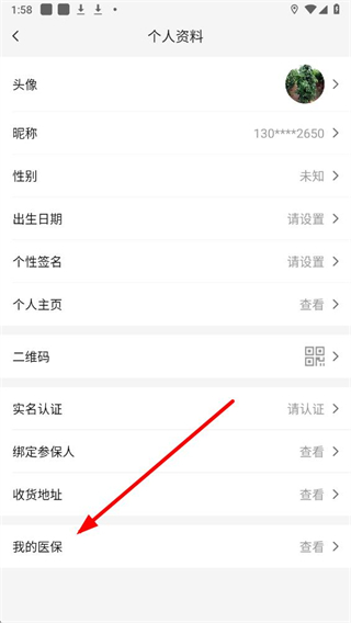 2、在个人资料页面,找到我的医保选项并点击查看,进入医保页面。