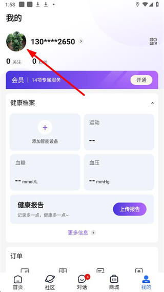 1、打开老来健康app,在我的页面中,点击头像区域,进入个人资料页面。