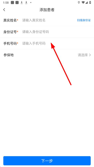 4、进入添加患者页面,填写信息后,点击下一步完成患者信息添加。