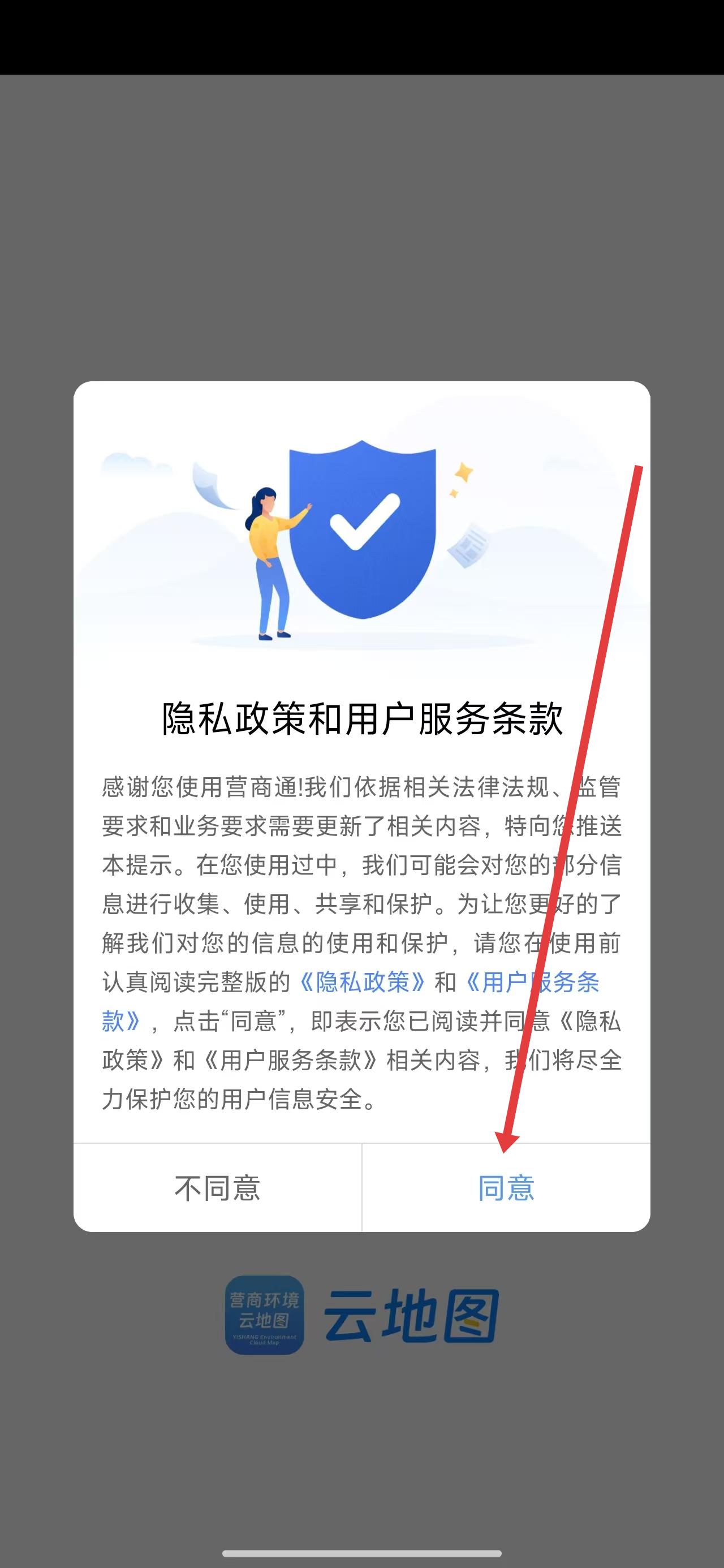 1、在打开营商环境云地图app后,点击弹窗中的同意按钮后进入使用。
