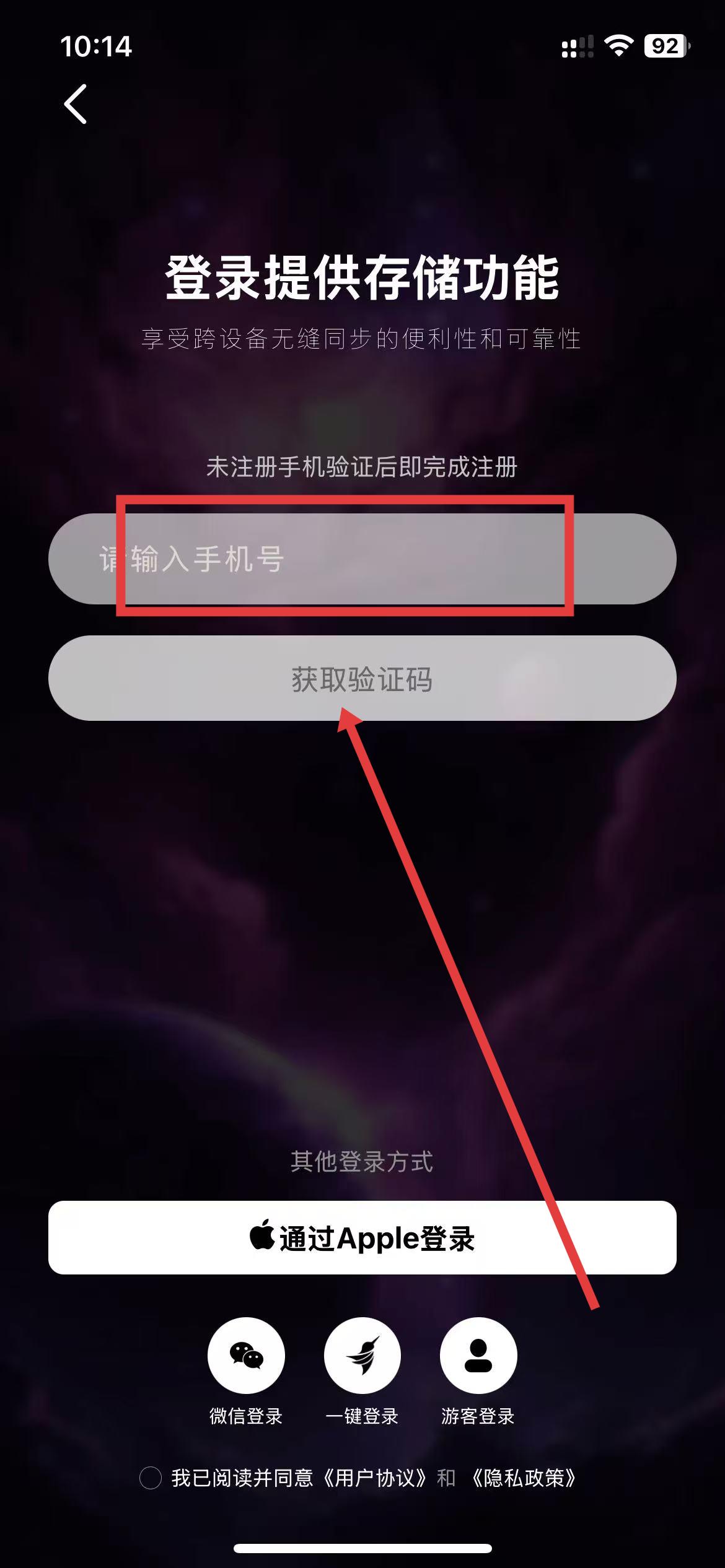 3、在登录注册页面,输入手机号,点击获取验证码。