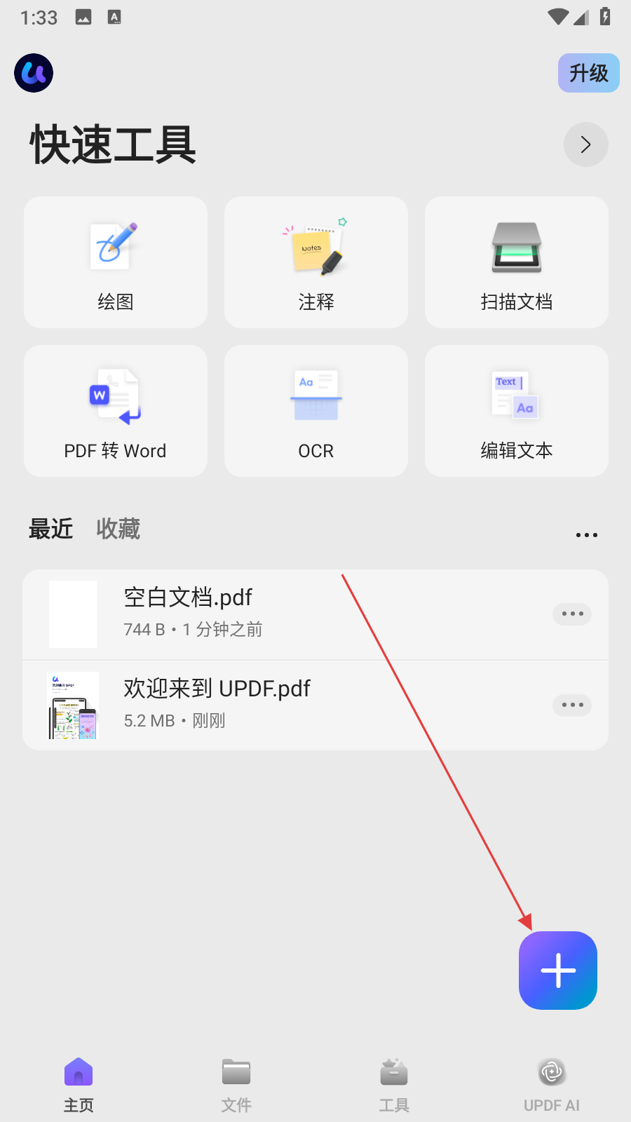1、打开UPDF应用,点击界面右下角带有+标识的按钮。
