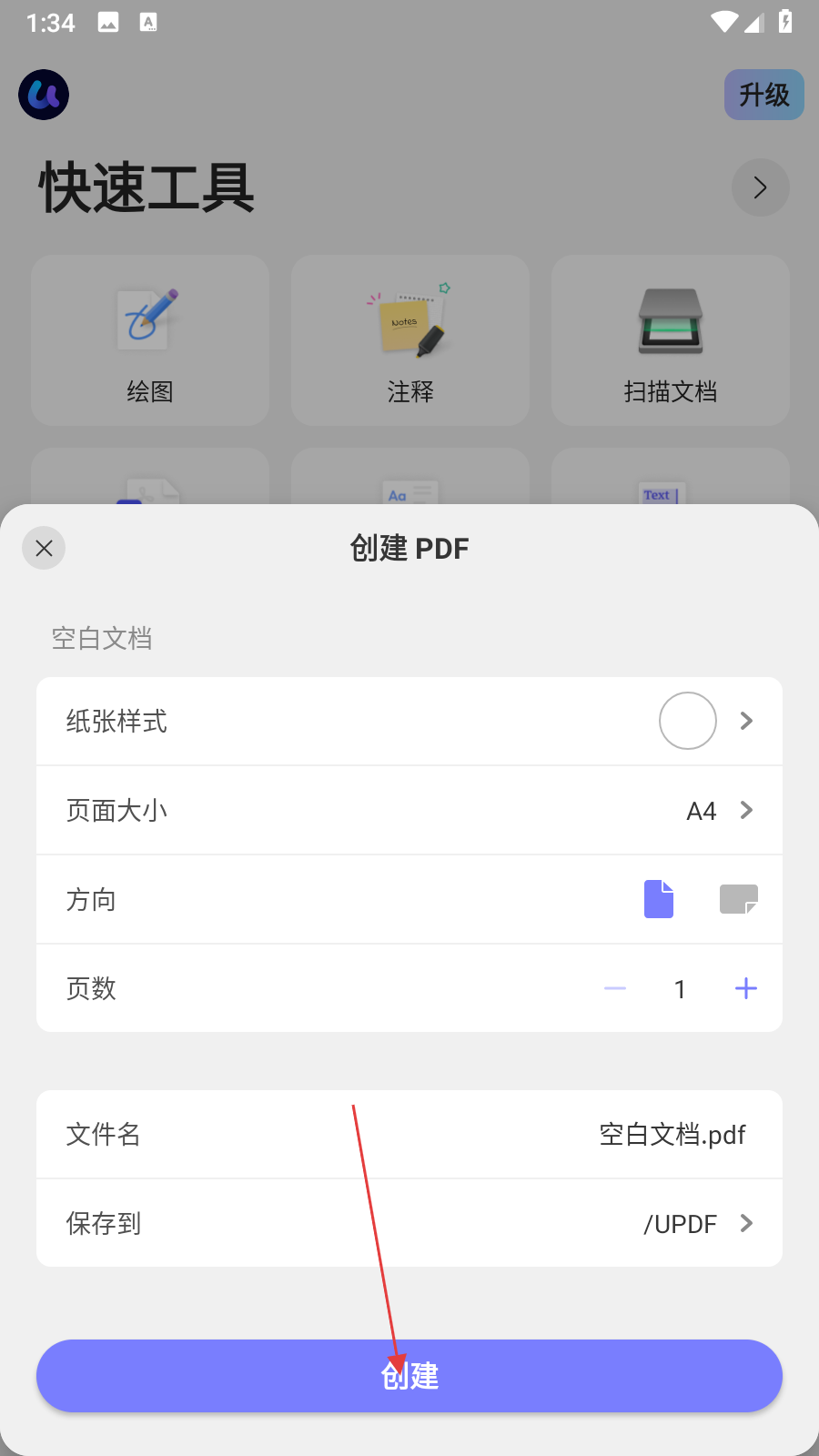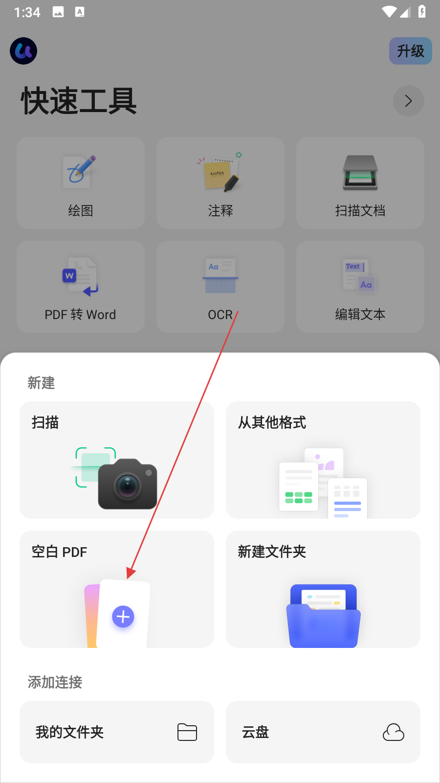 2、在弹出的菜单中,点击空白PDF选项,进入创建PDF的设置界面。