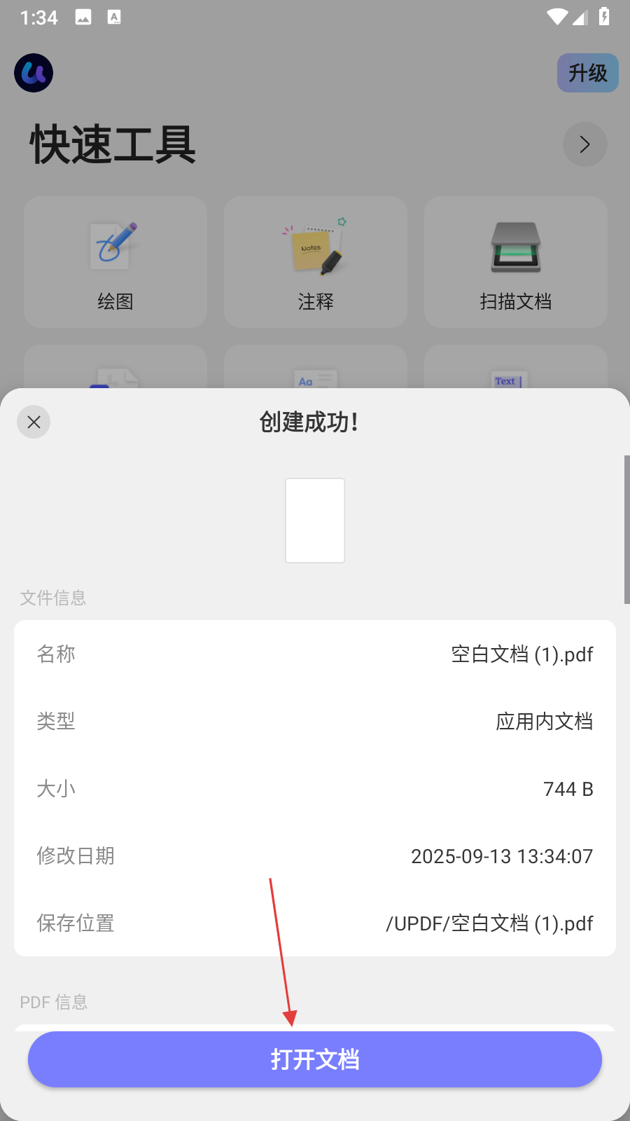 4、文档创建成功后,会弹出创建成功的提示窗口,点击窗口底部的打开文档按钮。