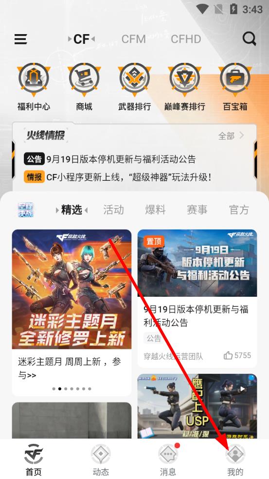 1、打开掌上穿越火线APP,点击底部导航栏中的我的进入个人页面。