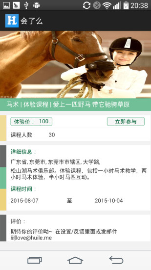 会了么是一款音乐学习平台,在这里有各类音乐课程,包括钢琴、吉他、古筝、小提琴、大提琴、萨克斯、萧、笛等中外经典乐器,大部分课程完全免费,而部分课程需要收费使用,毕竟现实中学习音乐的价格是十分昂贵的,欢迎广大音乐爱好者前联合网站www.huile.me集中发布各类优质休闲课程。联合注册、登录:与会了么网站(www.huile.me)共用统一账户,多平台操作更方便。课程展示与报名:发布优质课程信息,用户浏览并通过手机联系商家报名,也可登录会了么网站(www.huile.me)一键报名。设置与修改:用户可通过app端设置昵称,修改密码等操作。账户随时管理,更加方便。会了么网站和app立足深圳,同时正在开发北京、上海和香港市场。目前已经收集数百商家,开展线下服务,涉及极限运动、手工制作等多个领域。