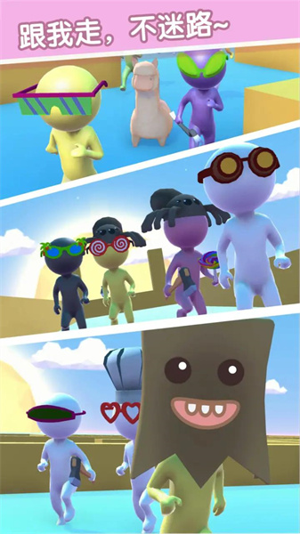 游戏的游玩元素很丰富,有跑酷、迷宫等,不同的元素游玩起来的体验感都是不一样的,在游玩的时候,要快速的避开出现在面前的障碍物,一旦中招是非常的危险的,会耽误大量的时间,可以就会落后,导致游戏的失败,关卡会随机出现不同的道具,可以合理的运用不同的道具来帮助我们快速的到达终点,获得大量的奖励,解锁新的角色皮肤来游玩。