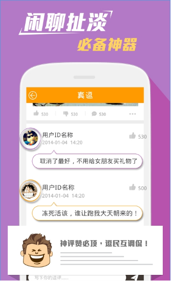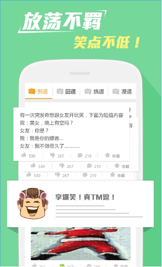 真逗笑话app是一款提供各种笑料的软件,它不仅提供图文形式,还有gif动态图形式,除此之外,段子内容更加无下限,让你不再看到那些看烂了的段子,感兴趣的朋友快来下载使用吧!