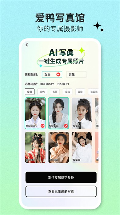 爱鸭写真馆软件是一款非常好用的线上智能写真软件,并且还能有着丰富多样的写真素材模版,新手用户只需要跟着软件的操作就能轻松使用,一键智能生成写真的效果会非常的便利,同时其中还有海量的创作滤镜和素材,都能根据自己的需要进行调整,打造真实的写真照片。