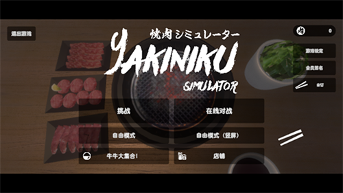 1、烧肉模拟器是一款日式烤肉模拟游戏,首先我们下载安装好游戏,点击进入,会看见有挑战/在线对战/自由模式等不同的游戏模式,玩家可以根据自己的喜好选择一个模式开始游戏;
