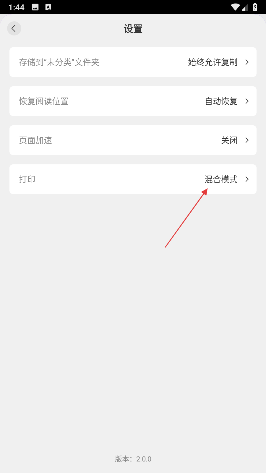 3、在设置界面里,点击打印选项,进入打印模式选择页面。