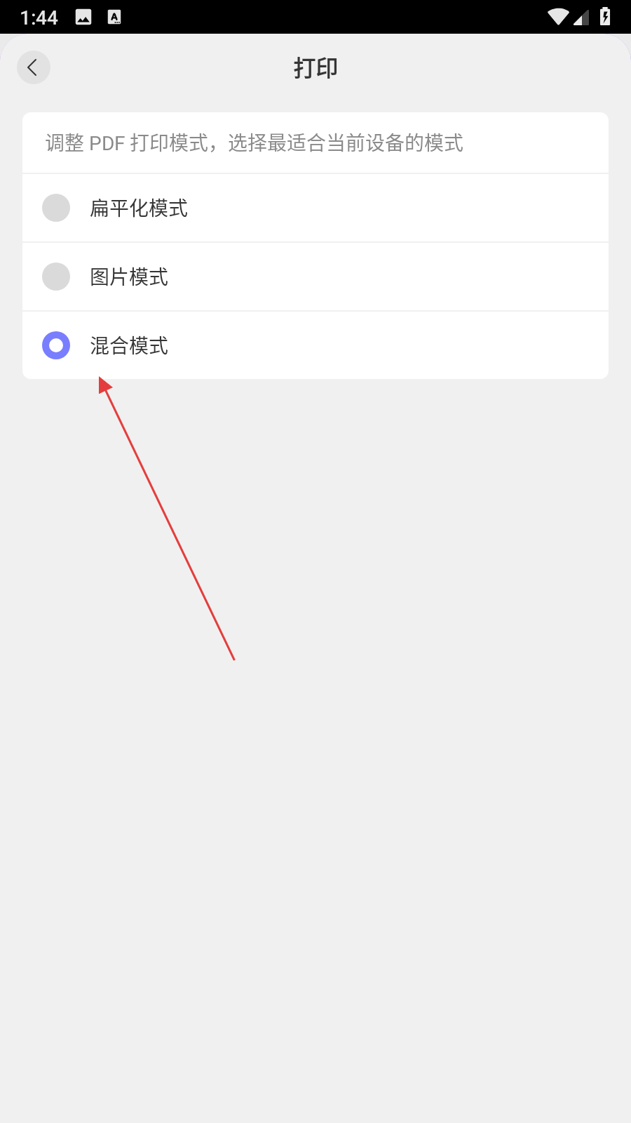 4、根据需求,在打印模式选择页面中点击对应模式前的单选按钮,即可完成打印模式的调整。