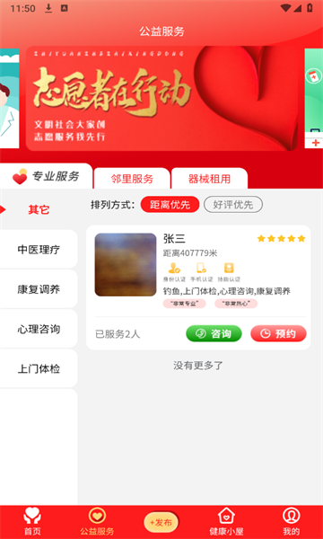 桔登健康软件是一款轻松帮助社区老年人的实用软件,很多年轻的志愿者愿意来养老院帮助老年人,并且还能解决很多存在的问题,这对于老年人来说也是非常有趣的,其中还有很多的生活常用服务,如报修、投诉等等,能够解决很多日常生活的常见问题,每月都有志愿者的报名窗口,通过自己的能力来帮助更多的老年人,这样才能有效关注邻里关系,实现邻居之间的互帮互助,有任何社区问题也能直接反馈,非常的便利。