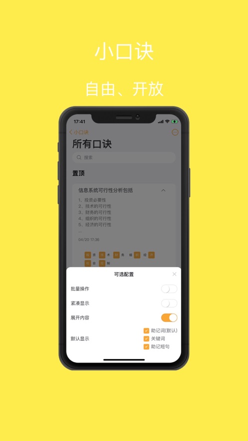 小口诀app是一款能够帮助用户快速找到学习笔记的软件,通过软件记录大量的知识点,这样都能自动生成选项,帮助用户更加快速的记忆和学习,并且还能记录很多日常生活方面的注意事项,能够轻松生成顺口溜,让用户能提高学习的效率。