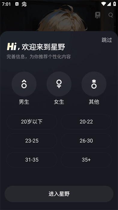 1、打开软件就会有一个条件选择,在这里不需要选择,只需要点击【跳过】就可以直接进入到软件首页;