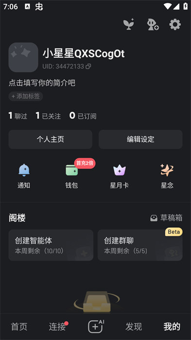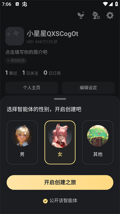 3、登录我们的账号之后,在个人主页界面,就可以直接点击下方的【创建智能体】创建智能对话窗口;