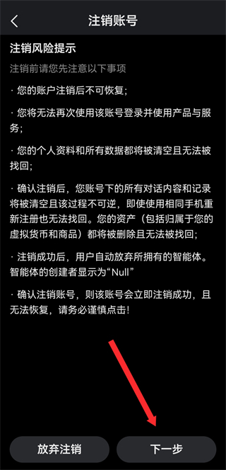 4、在注销账号的页面,点击下一步,完成账号的注销操作。