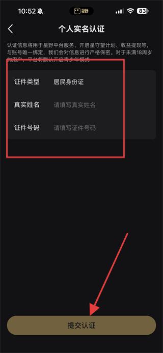 4、在个人实名认证页面,填写证件类型、真实姓名和证件号码后,点击提交认证按钮,即可完成实名认证操作。