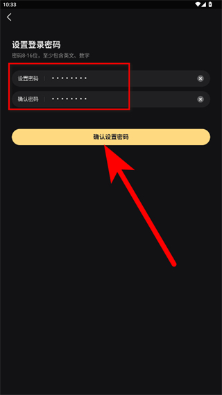 5、在设置登录密码页面设置密码并确认密码,点击确认设置密码,即可完成星野密码的设置。