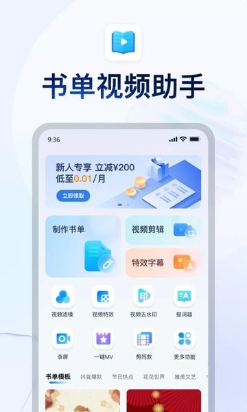书单视频助手app是一款可以将小说或者视频创作成书单的软件,其中包含了大量的视频剪辑工具,同时还能加上字幕、滤镜特效等素材,让整个视频变得更加流畅,同时还能看到一些专业的配音,将文章通过配音和视频相结合,打造更加生动的效果。