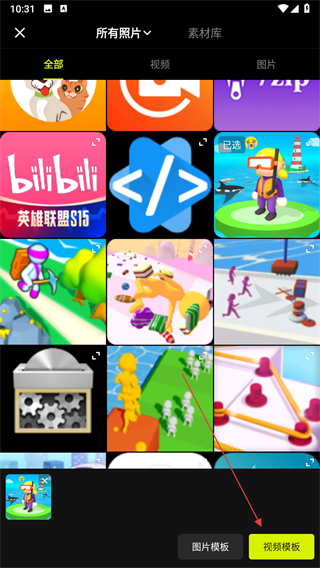 4、挑选需要使用的素材,点击视频模版。