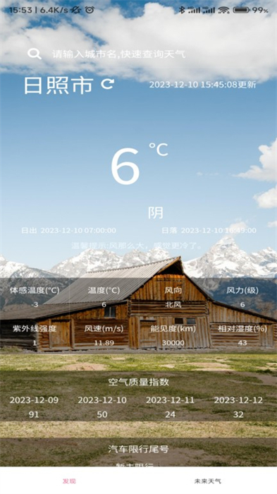 3、风力指数:拥有详细的风向和风力等级,方便了解户外活动的适宜程度;