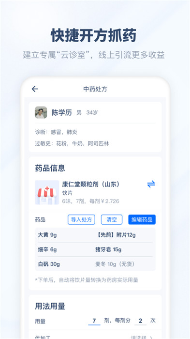 3、线上就能接诊开方子,可以随时随地进行线上接诊,开出对应症状的电子处方;