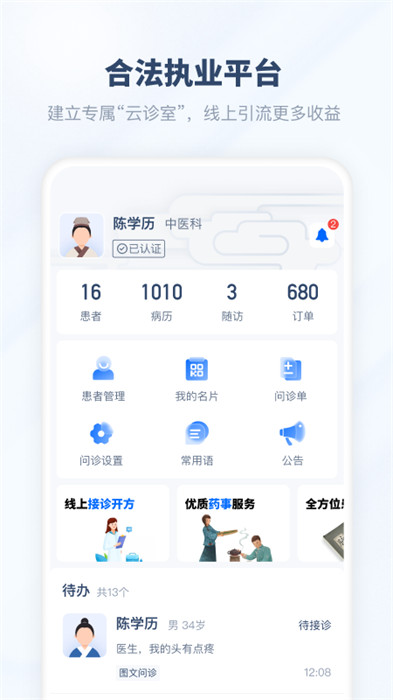 脉景医生端是一款优质实用的中医问诊的应用软件,通过这款软件用户可以随时随地的进行中医的问诊,是十分好用的,提供了十分丰富的专业知识,让用户可以随时轻松地进行接诊问诊,打造了医生个人的网上诊室,随时随地在线进行接诊,高效灵活的完成接诊。