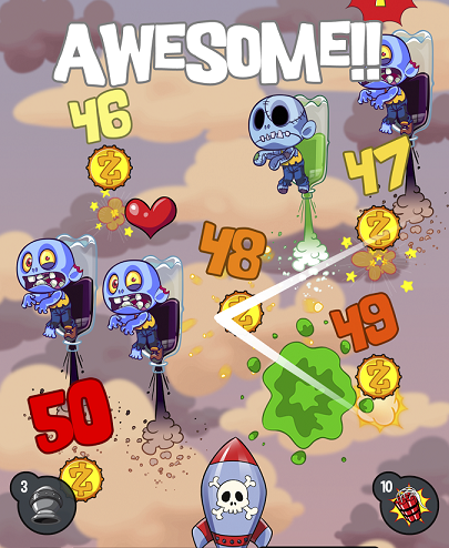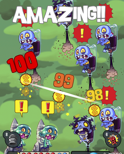 在僵尸赏金猎人中虽然可以和水果忍者一样滑动消灭僵尸,但是滑动一次性最多只能消灭3只,而且游戏进行到后期,僵尸和人类的上升速度会越来越快,滑动消灭的话容易失误,将人也消灭了,三颗爱心的生命值是非常少的,所以还是建议用点击的操作来消灭僵尸,当然速度一定是越快越好啦!