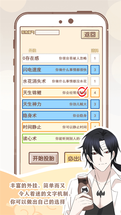 3、可以自由选择三个自己最想要的外挂,并根据选择的外挂改变自己的人生;