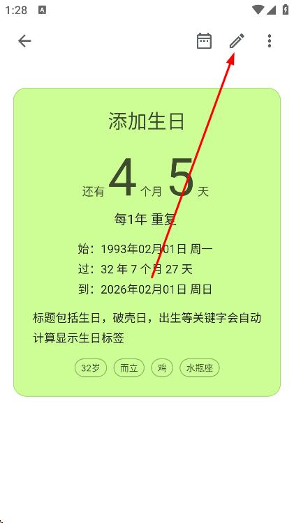 2、进入生日详情页面后,点击右上角的编辑图标。