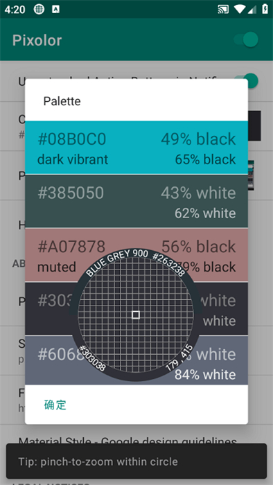 pixolor最新版是一款能够以便捷的方式获取手机屏幕上任何像素的真实颜色值的app,无论是从图片中提取的颜色还是来自应用界面的色彩,都能实时获取,只需将取色框对准目标区域,就会自动识别并显示对应的RGB值,使得我们能更加方便快捷地获取颜色数据,同时,提供了取色历史记录功能,可以轻松管理之前取得的颜色,方便在后续的设计工作中使用,此外,还配备了颜色拾取器,能从任何屏幕上的像素中提取颜色,有助于我们更好地进行颜色调配和搭配,使我们的设计和调色工作更加轻松。