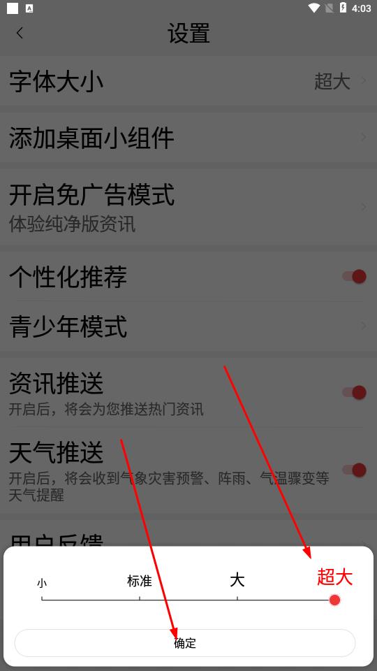 3、在字体选择弹窗中,拖动滑块至超大位置,点击确定按钮,应用大字体显示,优化阅读体验。