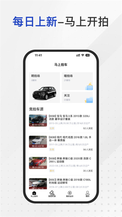 马上拍车app是一款十分好用的手机购物类软件,是一个专门为了用户进行购买二手车的软件,为用户提供了许许多多丰富的二手车信息,让用户可以随时满足自己的购买需求,车源十分的丰富,车况也十分的透明,为用户们提供了优质的二手车车源,实时进行二手车的上新,押金特别的少。