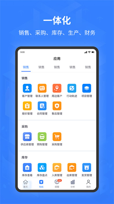 2、拥有客户的录入、销售跟进、移动进行开单、库存的查询和生产汇报等;