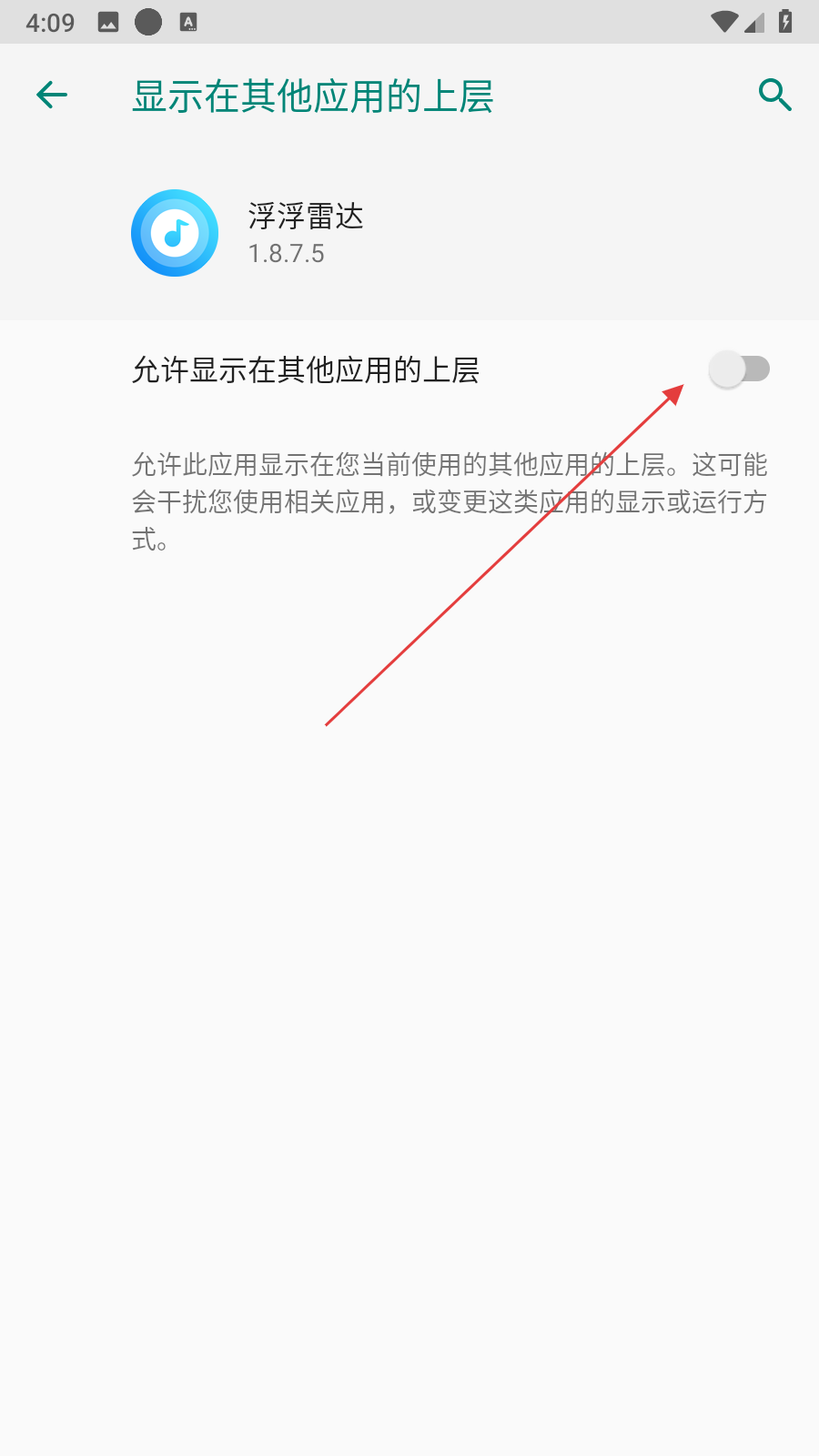 3、跳转至手机系统的显示在其他应用的上层设置页面,点击允许显示在其他应用的上层右侧的开关,将其开启。