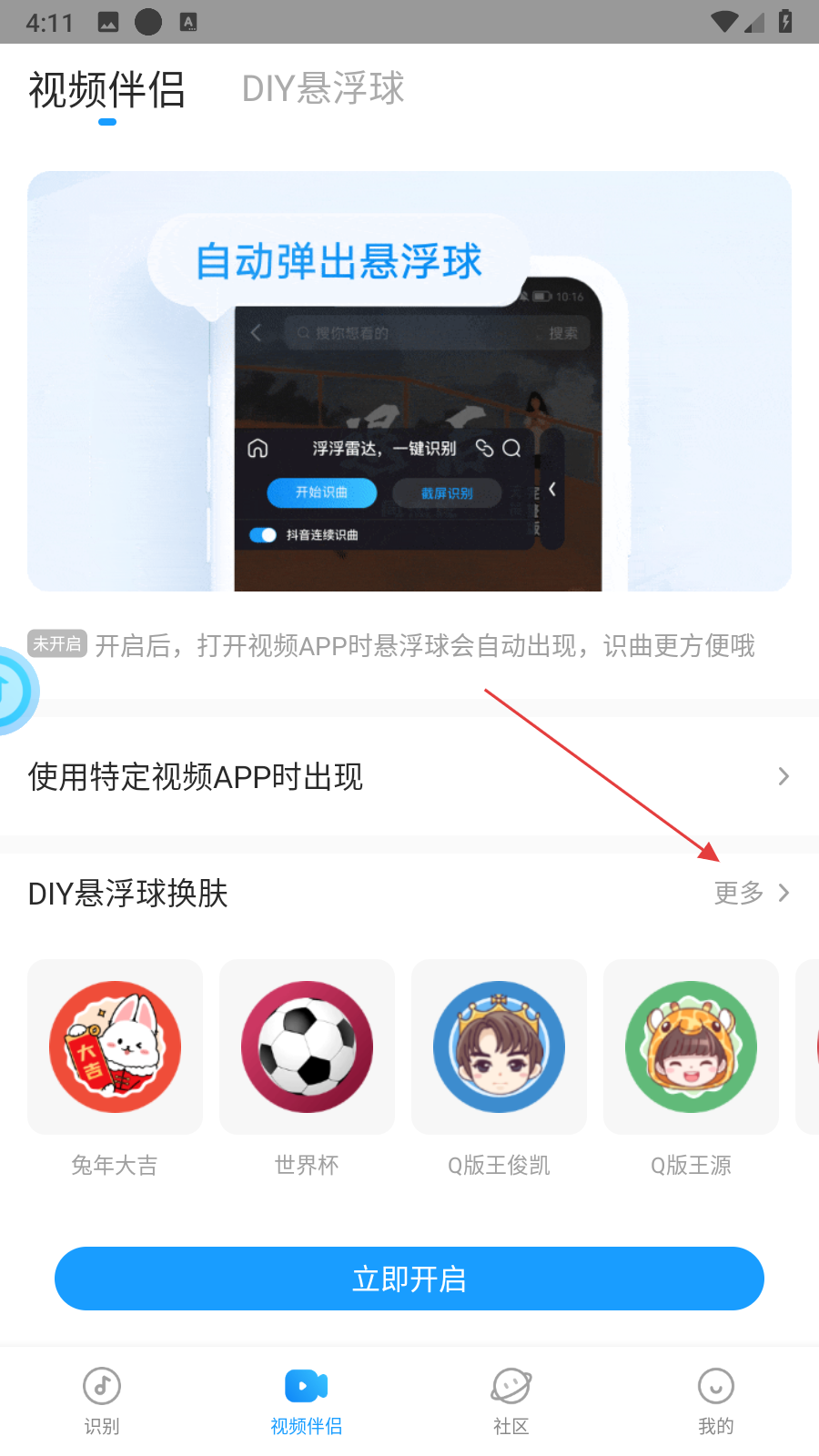 2、在视频伴侣页面中,找到DIY悬浮球换肤区域,点击其右侧的更多按钮,进入DIY悬浮球皮肤选择界面。