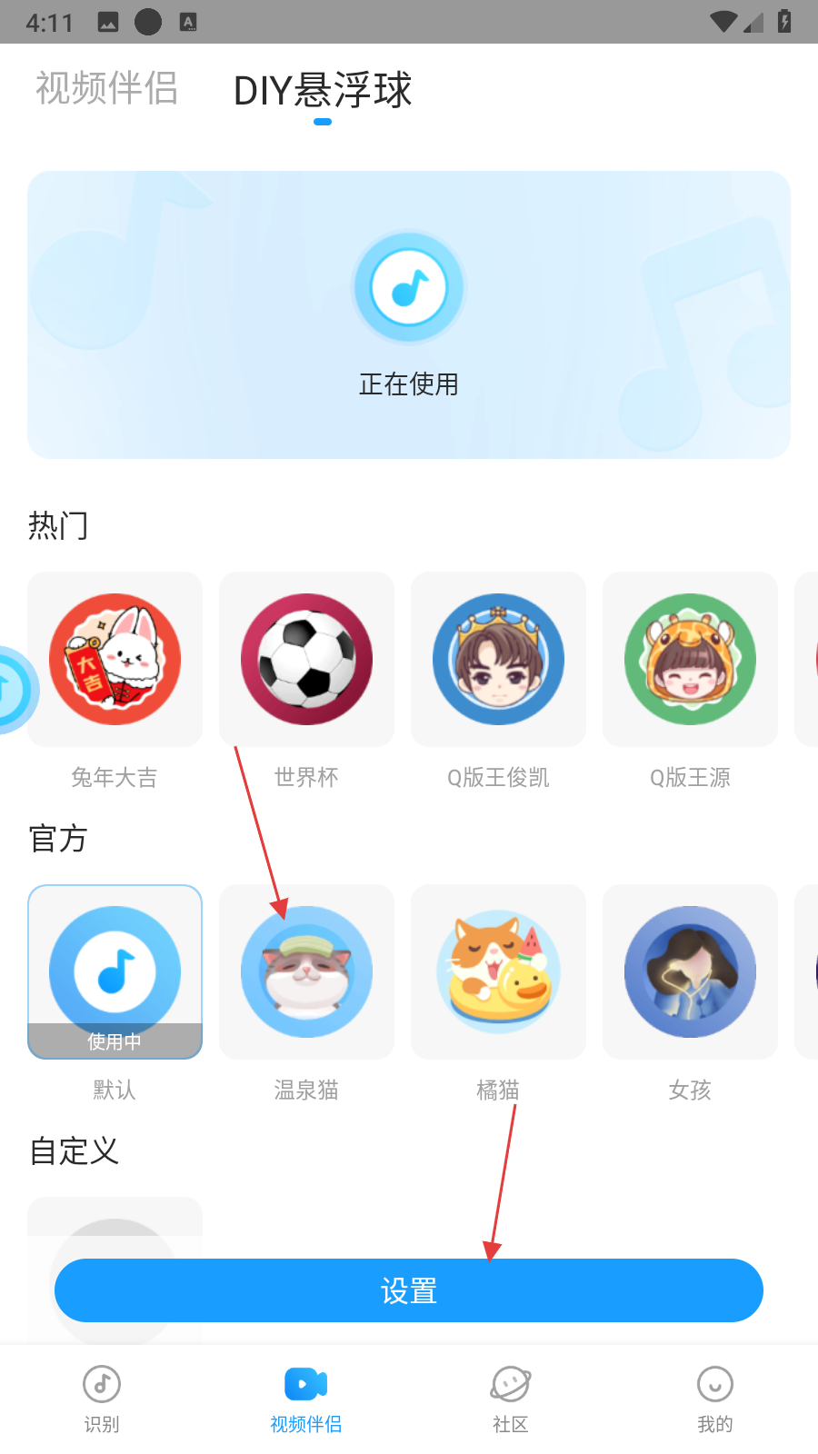 3、在DIY悬浮球皮肤界面,选择自己喜欢的悬浮球皮肤,选中喜欢的皮肤后,点击界面下方的设置按钮。