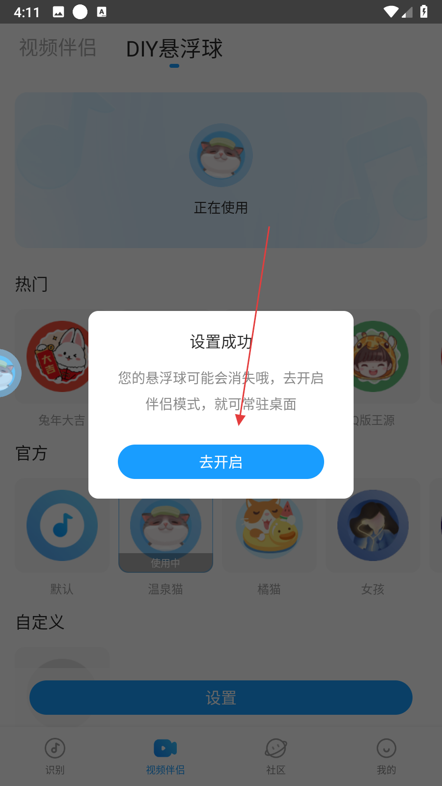 4、完成悬浮球皮肤的更换之后,若弹出去开启伴侣模式可常驻桌面的提示,可根据需求点击去开启设置即可。