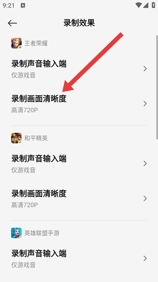 3、在录制效果页面,点击对应游戏的录制画面清晰度选项,展开选择列表。