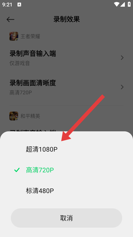 4、在清晰度选择列表里,点击超清1080P,即可将录制清晰度设置为最高。