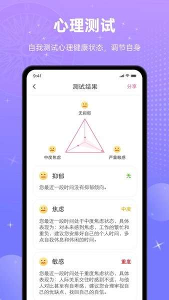 b、准确解析,无论是星座测试还是心理测试题,软件都能够提供精准的解读和评估;