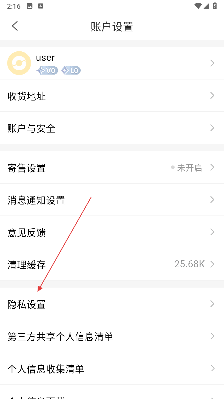 3、在账户设置界面里,找到隐私设置选项并点击,进入隐私设置页面。