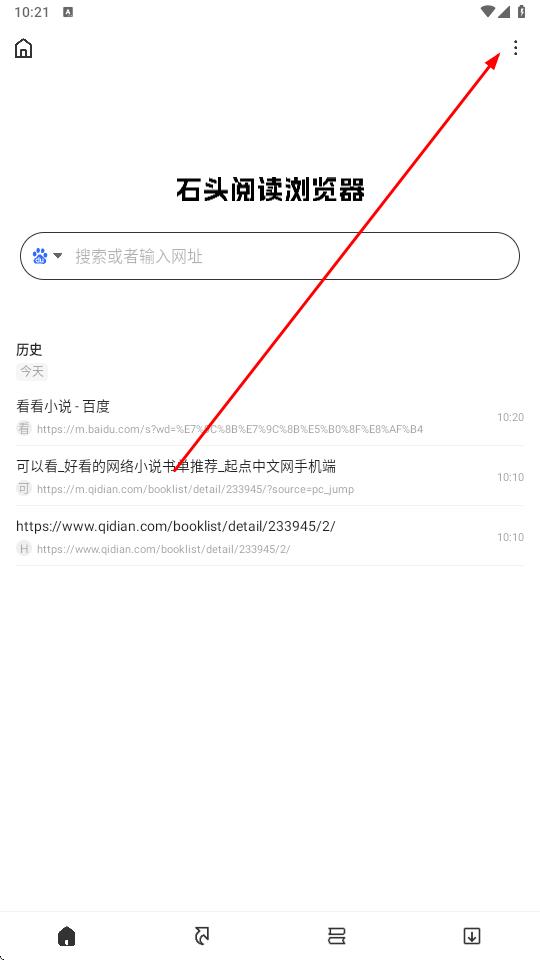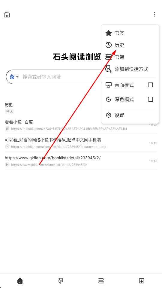 1、启动石头阅读浏览器,定位界面右上角垂直排列的三点图标并点击,弹出包含书签、历史、书架等功能的下拉菜单,菜单样式简洁明了。