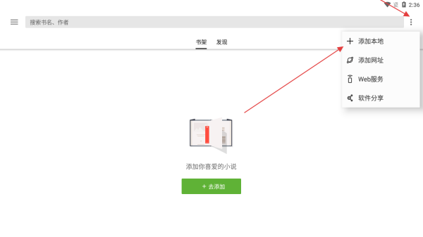 1、打开轻阅小说应用后,点击界面右上角三点图标,在弹出菜单中点击“添加网址”,这是导入书源的关键操作,确保能开始添加书源流程。